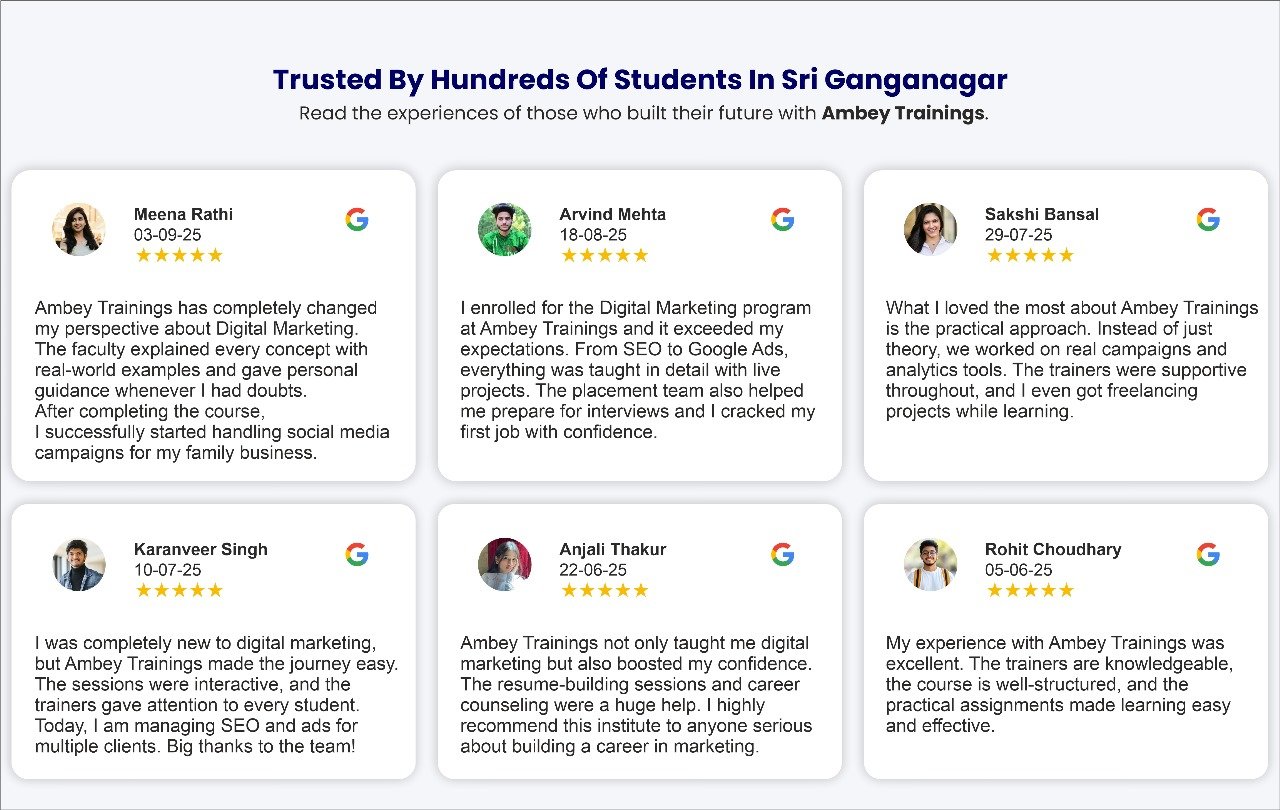 Here is a video testimonial from our alumni! 🎥 Check out how Ambey Trainings provides the best Digital Marketing Classes in Sri Ganganagar.